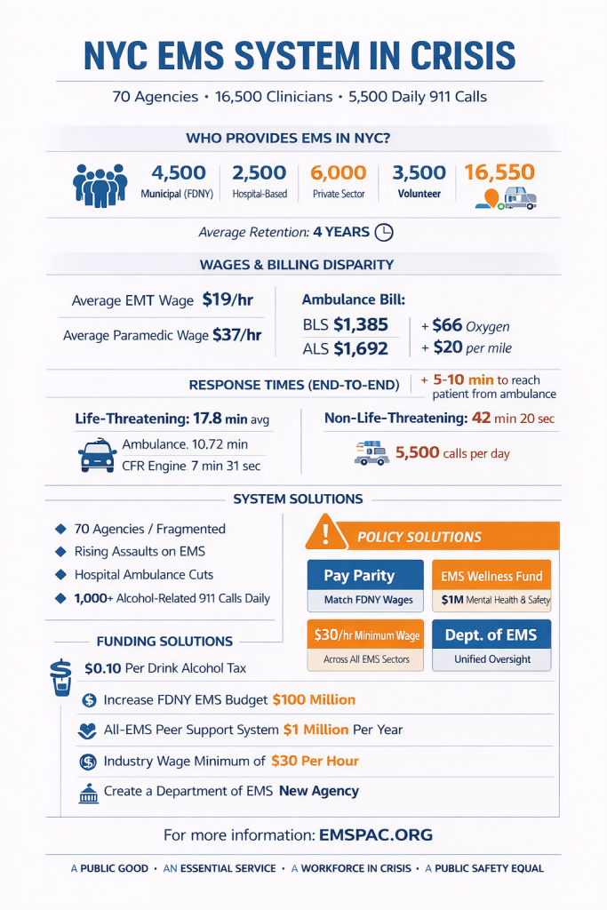 Response times reflect the strain. A life-threatening call waits nearly 18 minutes for an ambulance. Firefighter first responders, who cannot transport patients, average over 23 minutes, while structural fires receive units in under 6 minutes. FDNY EMS handles about 65% of 911 volume, hospital-based EMS about 35%, with additional calls outside the system. Ambulance bills are between $500–$1,692 per run; FDNY EMS generated $400 million in FY2025 revenue. None of which returns directly to the department, while hospitals increasingly compete for a larger share of the system. While ambulance providers bill for everything, paying the EMS workers has never been anyone’s priority. None of the agencies can retain staffing. The average time an EMT or Paramedic spends in the field is under 4 years. The average wage of an EMT across all sectors is just $19.00. The FDNY EMS have not had a contract in 3 years.