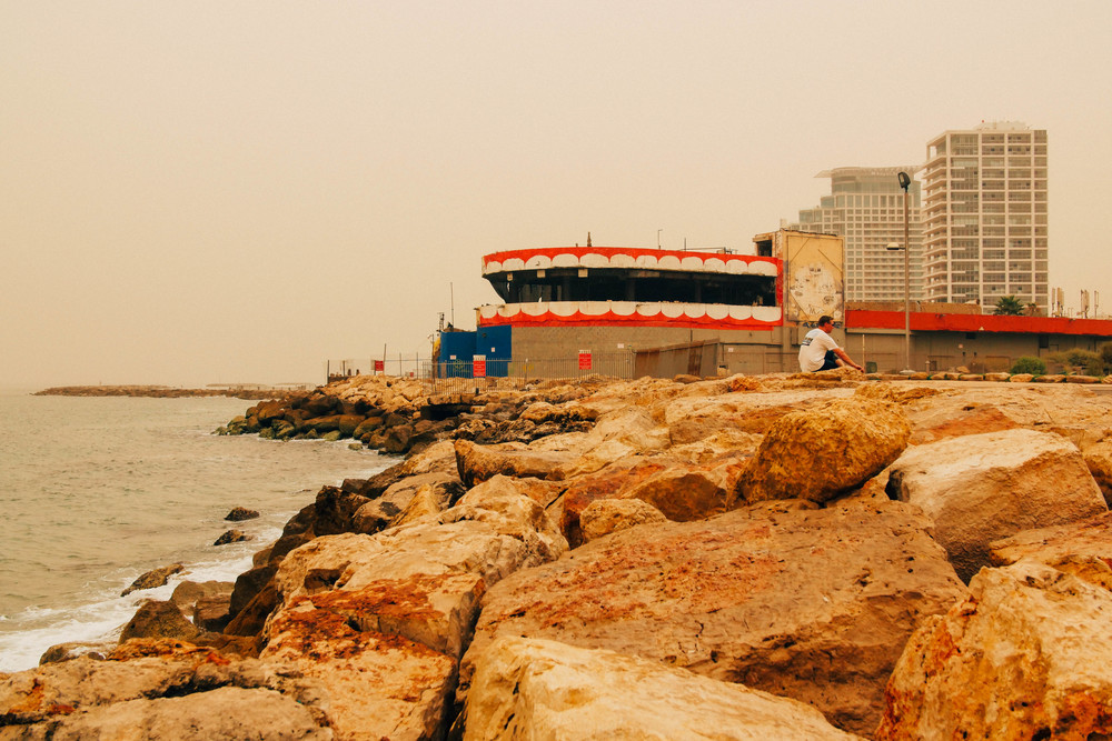 The waves are crashing against the levy. The rocks extend out into the water, and you can walk along them toward the end, which is as good a place as any to smoke hash. The levy is on the sea side of the Dolphinarium. This section of the Beach is called Tiki Beach. During the day people play Congo drums and an outdoor café serves overpriced beverages with a scenic view. There is a private club next to the Pasha and a barbed wire fence prevents people from climbing from the levy into its outdoor section. House music is blaring from Pasha.